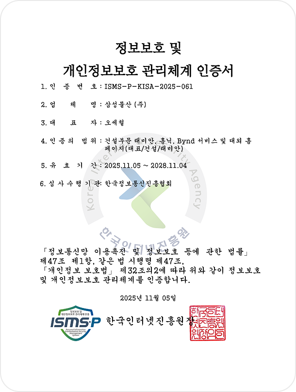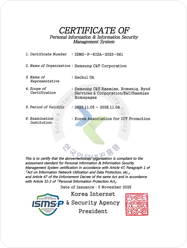 In September 2025, Samsung C&T’s Construction Division obtained ISO/IEC 27001 certification, the leading international standard for information security management. This achievement demonstrates our capabilities in protecting information assets, strengthens global competitiveness, and enhances trust with overseas clients and partners.