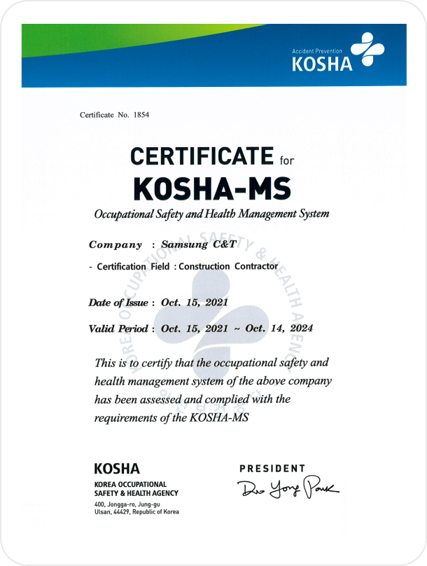 ISO 45001 emphasizes participation from all organizational levels, from management to workers, with the aim of providing a safe and healthy workplace for employees and preventing work-related injuries and occupational diseases. Established as an international safety standard in March 2018, it was developed through consensus between the International Organization for Standardization (ISO) and the International Labor Organization (ILO). Samsung C&T’s E&C Group first acquired the globally recognized OHSAS 18001 certification in March 2009, and has been operating a safety and health management system since transitioning to ISO 45001:2018 certification in December 2018.