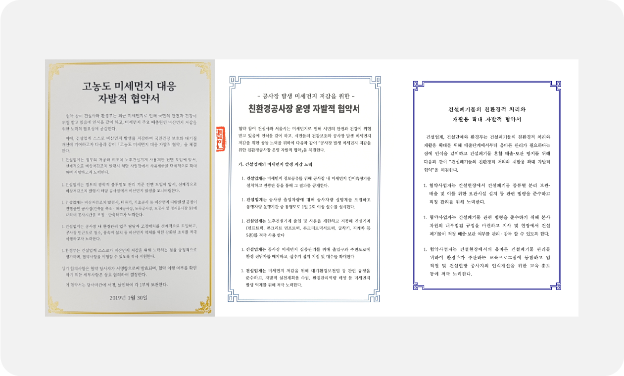 삼성물산 건설부문은 2019년부터 환경부와 미세먼지로 인해 국민의 안전과 건강이 위협받고 있음에 인식을 같이 하고, 미세먼지 주요 배출원인 비산먼지 저감을 위한 노력의 필요성에 공감하여 [고농도 미세먼지 대응 자발적 협약]을 체결하여 이행하고 있습니다. 그리고 2022년에는 건설폐기물 배출단계에서부터 올바른 관리가 필요하다는 점에 인식을 같이하고 건설폐기물 혼합 배출∙보관 방지를 위해 [건설폐기물의 친환경적 처리와 재활용 확대 자발적 협약]을 체결하여 이행하고 있습니다. 또한 서울시와는 2022년부터 [공사장 발생 미세먼지 저감을 위한 친환경공사장 운영 자발적 협약]을 체결하여 환경 전담자 배치, 공사차량 실명제 도입, 통행도로 주기적 살수, 노후건설기계 출입∙사용 제한 등의 협약사항을 적극적으로 이행하고 있으며, 당사의 이런 노력을 인정받아 2023년 9월에는 2개 현장과 본사 환경팀이 서울시장 표창을 받았습니다.