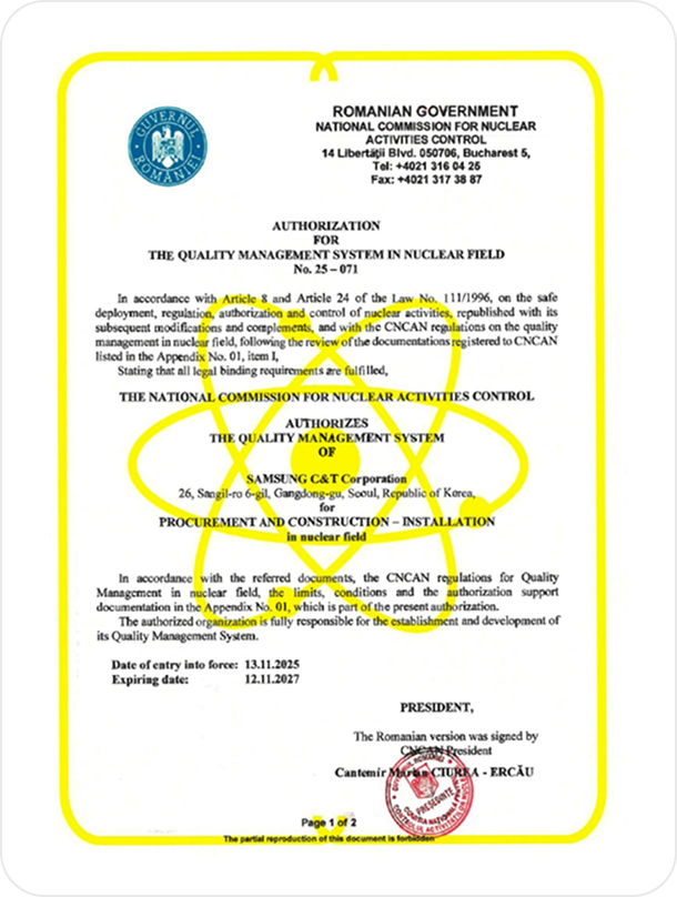 루마니아 원자력 인증서는 루마니아 원자력 사업 참여를 위한 필수 요건으로, 원자력 규제 기관인 CNCAN(National Commission for Nuclear Activities Contol)에서 발행되는 인증서입니다. 삼성물산 건설부문은 2023년 11월 최초로 인증을 취득하였으며, 2년 마다 인증서 갱신 중입니다. NMC 06(구매), NMC 08(시공/설치) 및 NMC 05(설계), NMC 12(소프트웨어 사용) 분야에 대한 인증을 지속적으로 보유하고 있습니다.